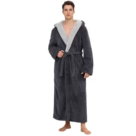 Long Robes for Men, Soft Fluffy Fleece Bath Robe with Front Pocket, Winter Warm Plush Hooded Men's Robes, Adjustable Belt