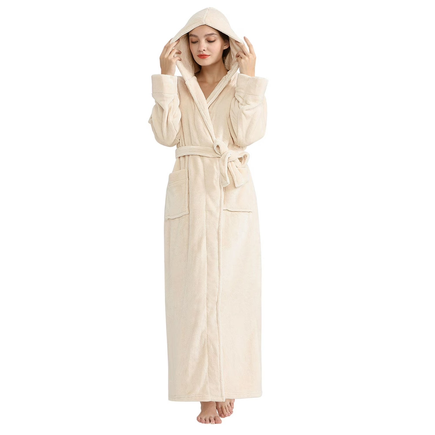 Women's Long Hooded Robe Luxurious Flannel Fleece Bathrobe with Mid-calf Ankle Full Floor Length